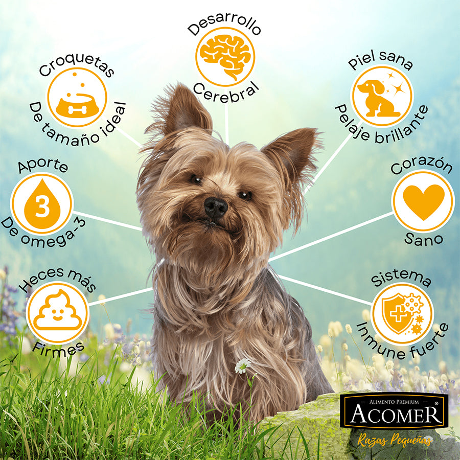 El alimento premium Acomer para perros adultos de razas pequeñas está creado siguiendo el principio de alimentos biológicamente apropiados, pensados para brindar la mejor nutrición a nuestras mascotas, respetando su evolución y preferencia por dietas ricas en proteínas y carne fresca.