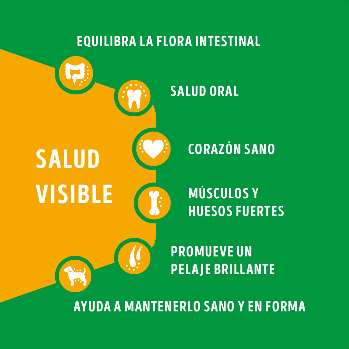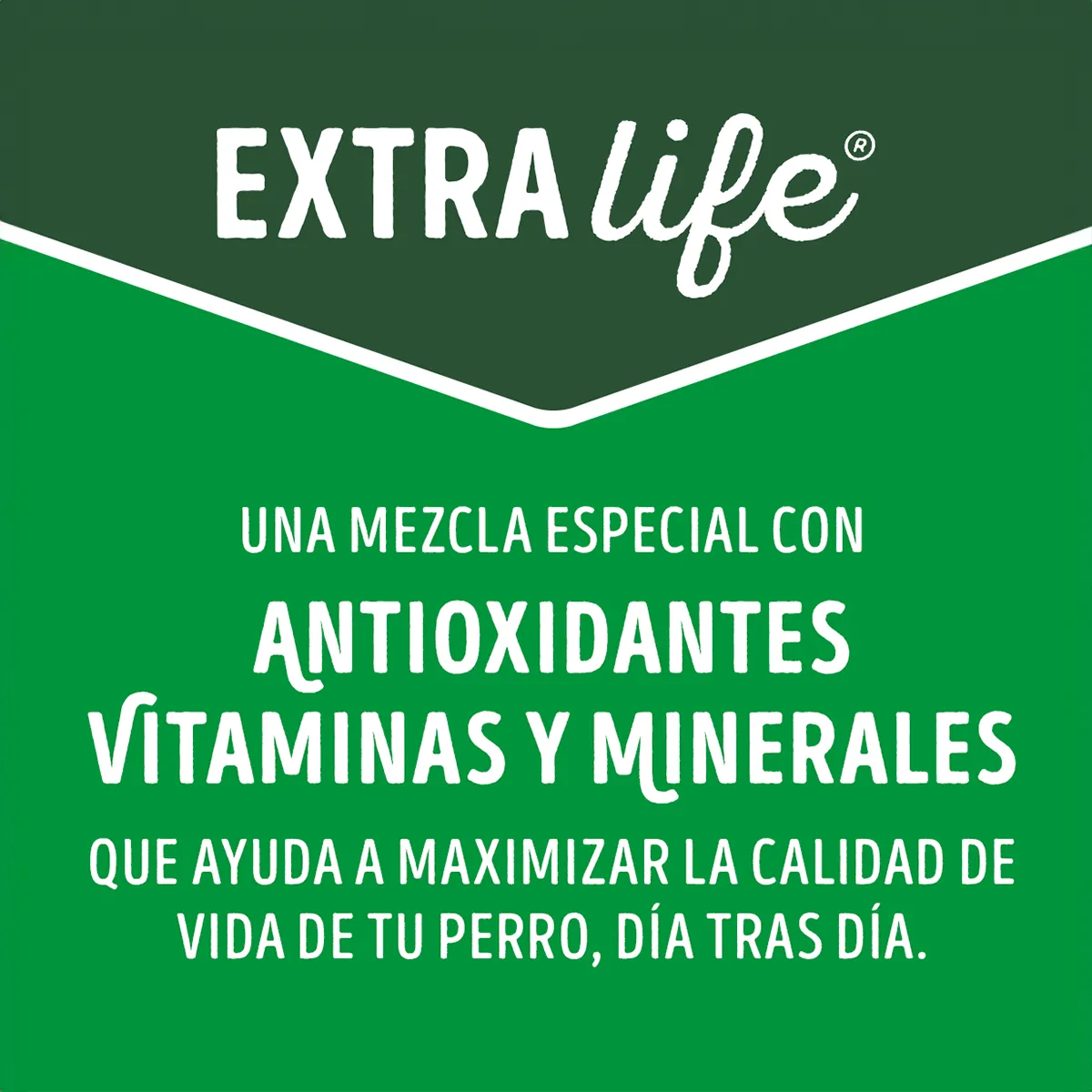 Alimento seco para perros adultos de raza pequeña, minis y pequeños DOG CHOW® con Carne y Pollo, sin colorantes. En cada croqueta encontrarás un alimento 100% balanceado, con probióticos naturales que equilibran su flora intestinal, omegas 6 y 3 y niveles de sodio adecuados. Ayuda a cuidar la salud oral, a mantener un corazón sano y tener músculos y huesos fuertes. Con Extralife, una mezcla especial de antioxidantes, vitaminas y minerales que ayuda a maximizar la calidad de vida de tu perro día tras día, entregando hasta 1,8 años más de vida saludable juntos.